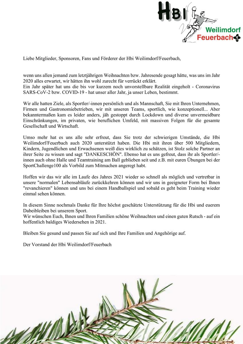 Umso mehr hat es uns alle sehr erfreut, dass Sie trotz der schwierigen Umstände, die Hbi Weilimdorf/Feuerbach auch 2020 unterstützt haben. Die Hbi mit ihren über 500 Mitgliedern, Kindern, Jugendlichen und Erwachsenen weiß dies wirklich zu schätzen, ist Stolz solche Partner an ihrer Seite zu wissen und sagt "DANKESCHÖN". Ebenso hat es uns gefreut, dass ihr als Sportler/-innen auch ohne Halle und Teamtraining am Ball geblieben seit und z.B. mit euren Übungen bei der SportChallenge100 als Vorbild zum Mitmachen angeregt habt.