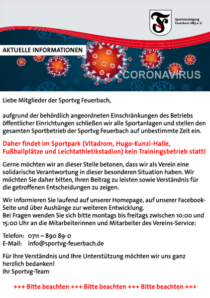 Die Landesregierung Baden-Württembergs hat Schulen und Kitas geschlossen, die Stadt Stuttgart öffentliche Veranstaltungen abgesagt und öffentliche Einrichtungen geschlossen. Unsere Stammvereine habe den Trainingsbetrieb in allen Abteilungen eingestellt und ihre Sportanlagen ebenfalls komplett geschlossen.