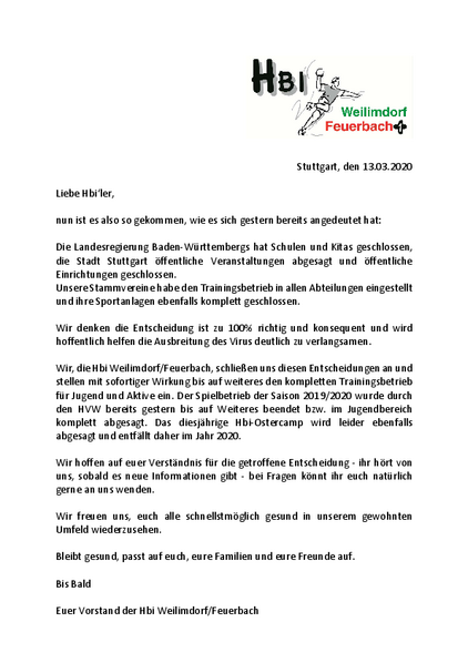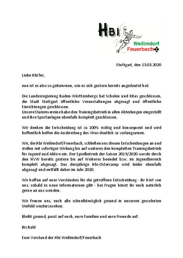 Wir, die Hbi Weilimdorf/Feuerbach, schließen uns diesen Entscheidungen an und stellen mit sofortiger Wirkung bis auf weiteres den kompletten Trainingsbetrieb für Jugend und Aktive ein. Der Spielbetrieb der Saison 2019/2020 wurde durch den HVW bereits gestern bis auf Weiteres beendet bzw. im Jugendbereich komplett abgesagt. Das diesjährige Hbi-Ostercamp wird leider ebenfalls abgesagt und entfällt daher im Jahr 2020.