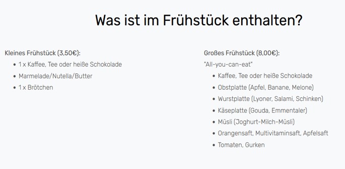 - Kleines Frühstück (3,50€) oder großes Frühstück (8€) *Info Frühstück